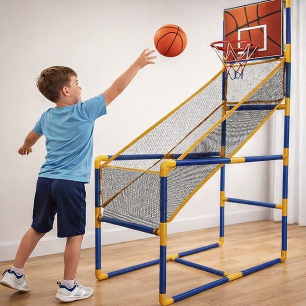 מתקן כדורסל לילדים עם רשת המחזירה באופן אוטומטי את הכדור ומאפשר אימון כדורסל נוח יותר עם אופציה לזריקות רבות יותר במהלך האימון.