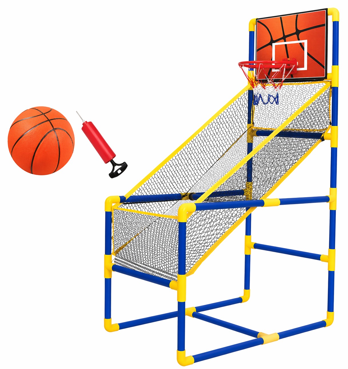 המוצר כולל מתקן, טבעת, רשת, כדורסל ומשאבה.